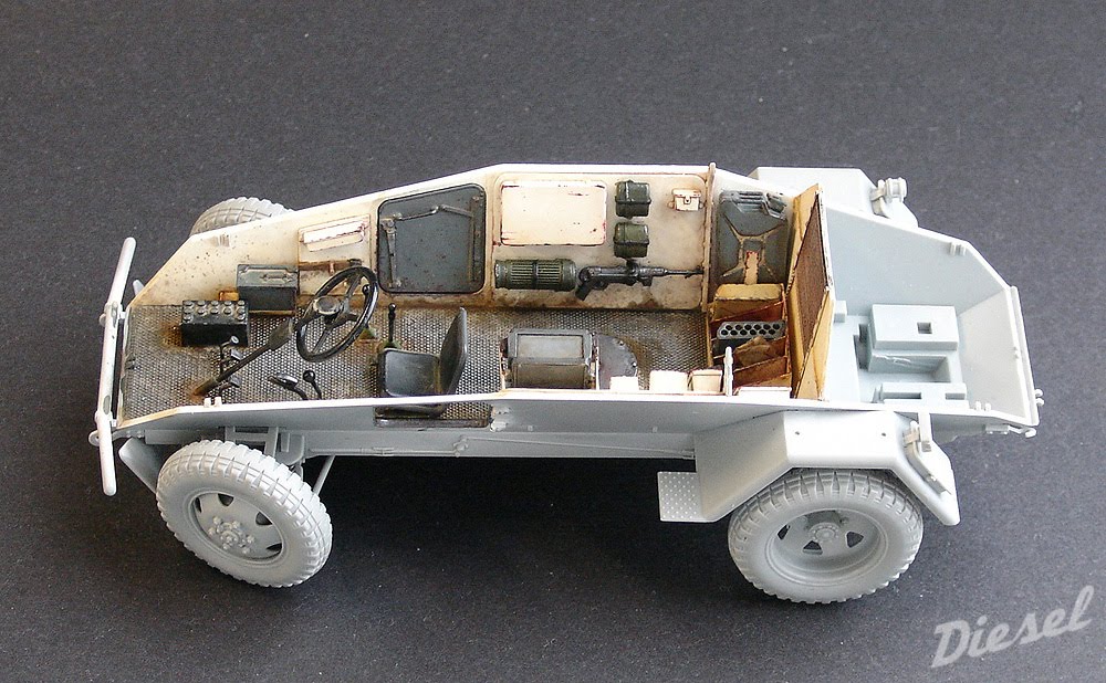 "A (last) night in Tunisia" para este viejo guerrero, al término de la campaña del Norte de África. El kit de Bronco es una buena maqueta pero por desgracia junto con algunos errores conserva el interior del 221 normal: el modelo equipado con el s.Pz.B. 41 tenía el interior modificado (munición, radio, etc.), y como la información detallada del mismo es escasa o inexistente, tuve que basar mi trabajo en el 222/223 y algunas suposiciones. Estoy muy contento con el resultado final y me ha cambiado la percepción que tenía del 221 como el "patito feo" de la familia: definitivamente es más bonito que los Sd.Kfz. 222 / Sd.Kfz. 223.